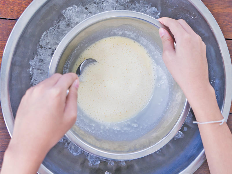 ضعي في الخلاط الكهربائي كوباً من الطحين، ملعقة صغيرة من السكر، ونصف ملعقة صغيرة من الملح وشغلي الخلاط إلى أن تمتزح هذه المكونات. أضيفي إليها بعد ذلك قالب زبدة غير مملحة (مقطعاً إلى 5 قطع) واضغطي على زر الخفق (pulse) خمس مرات أو إلى أن يتحوّل الخليط إلى كتل صغيرة ومتوسطة الحجم. انقلي خليط الطحين إلى وعاء كبير، رشي فوقه الماء شديد البرودة، الملعقة الكبيرة تلو الأخرى، وحركي العجينة بواسطة ملعقة مسطحة مرنة إلى أن تتحوّل إلى كتلة كبيرة متماسكة. ستحتاجين إلى 5 ملاعق كبيرة من الماء تقريباً. حوّلي العجينة إلى اسطوانة، رشي فوقها الطحين، لفيها بورق بلاستيكي، واتركيها في البراد مدة ساعة.نسخ صحية من الكريما المثلّجة بالفانيلا
