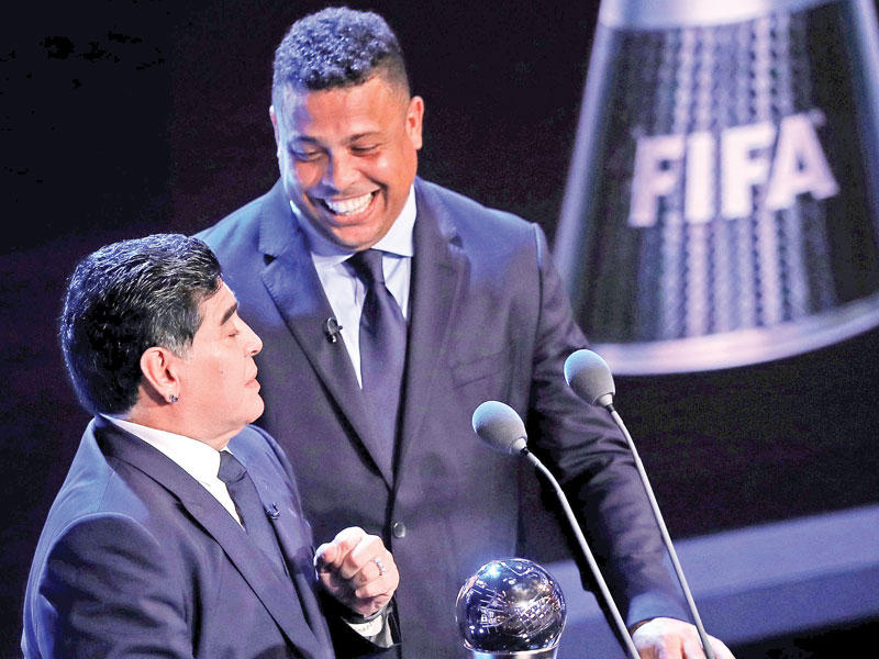 أجرى اللاعبان السابقان؛ الأرجنتيني دييغو مارادونا والبرازيلي رونالدو، اللذان قاما معاً بتسليم البرتغالي كريستيانو رونالدو جائزة الاتحاد الدولي لكرة القدم (الفيفا) للاعب الأفضل في العالم، أمس الأول، حوارا فكاهيا قبل مراسم تسليم الجائزة.وقال اللاعب البرازيلي لنظيره الأرجنتيني خلال انتظارهما الإعلان عن هوية اللاعب الأفضل في العالم: "كم كنت أتمنى أن ألعب بجانبك يا أخي"، ليرد مارادونا: "وأنا أيضا"، ليقول رونالدو هداف مونديال 2002 ضاحكا: "يا أمي".وبعد أن أكد مارادونا أن الفيفا يقوم بتنظيف صورته، عاد النجمان الكبيران للمزاح مرة أخرى، عندما سأل مارادونا زميله البرازيلي إذا ما كان قد قرأ أسماء المرشحين الثلاثة لنيل الجائزة؛ كريستيانو رونالدو وليونيل ميسي ونيمار، ليرد رونالدو: "تم عرض مقطع مصور لثلاثتهم".وقام مارادونا ورونالدو، برفقة رئيس الفيفا، السويسري جياني إنفانتينو، بتسليم جائزة "الأفضل" للاعب البرتغالي، الذي فاز بالجائزة للعام الثاني على التوالي.