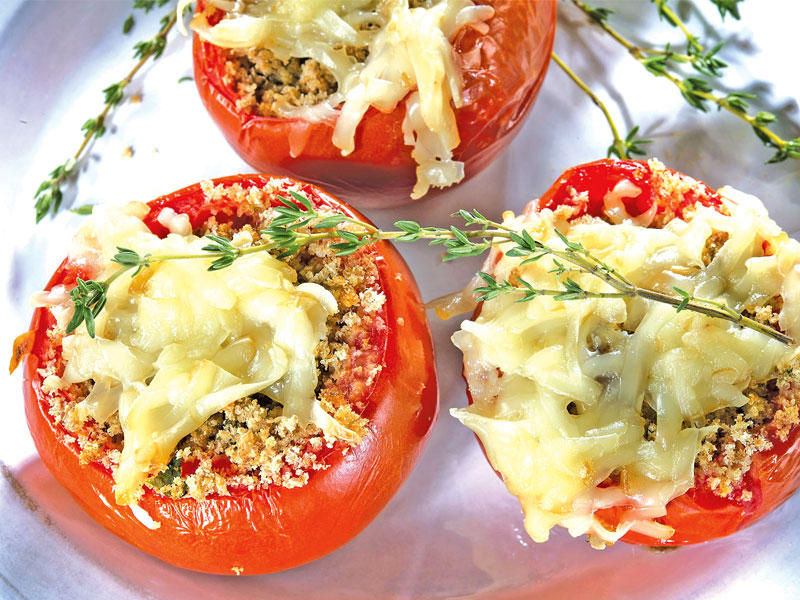 يحبّ الفرنسيون الطماطم المحلية لدرجة أنهم أطلقوا يوماً اسم «تفاح الحب» على فاكهة جديدة وغريبة، نظراً إلى قدرتها على تقوية الرغبة الجنسية.إذا شاهدت يوماً لائحة طعام فيها عبارة «على طريقة بروفانس» (وهي الطريقة المتبعة في هذه الوصفة) يعني ذلك أن النكهات تشتقّ في الأصل من جنوب شرق فرنسا حيث يركّز رؤساء الطهاة على استعمال الثوم والطماطم وزيت الزيتون.عند إضافة الصنوبر والجبنة الخفيفة إلى الطماطم، ستحصلين على طبق جانبي مثالي يناسب اللحوم المشوية أو وجبة منتصف الصباح، إذ يمكن تقديمه ساخناً أو بارداً.إذا كان المتجر الكبير الذي تقصدينه يبيع {جبنة بأعشاب بروفانس} (خليط من الغرويير والشيدر)، يمكنك حذف الزعتر الطازج من الوصفة.نصيحة أثناء التحضير: يعزّز تحميص الصنوبر نكهة الطعام. لتحميص الصنوبر، وزعي الحبوب على شكل طبقة في صينية، ثم اخبزيها على حرارة 175 درجة مئوية، بين 5 و7 دقائق، أو إلى أن تتحمّص الحبوب قليلاً.لإزالة جذوع الزعتر، انزعي أعلى الجذع بأصابع يد واحدة، واسحبي الجذع باليد الأخرى. ستسقط الأوراق تلقائياً.المقادير: