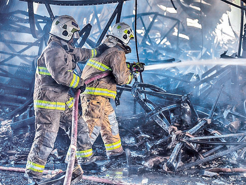 أصيب 5 إطفائيين بحالات اختناق وإجهاد حراري جراء مكافحة حريق كبير اندلع فجر أمس في مصنع للأثاث في منطقة صبحان، والذي أسفر عن خسائر مادية جسيمة لحقت بالموقع تقدر بملايين الدنانير، وأدى الحادث إلى انهيار سقف المبنى أثناء عمليات المكافحة، مما شكل خطراً على رجال الاطفاء اثناء تعاملهم معه.وفي التفاصيل، التي رواها مدير ادارة العلاقات العامة والاعلام بالإدارة العامة للإطفاء العقيد خليل الامير، أن الإدارة تلقت بلاغا فجر أمس يفيد باندلاع حريق في مصنع ومخزن للأثاث بمنطقة صبحان الصناعية، مشيرا الى انه فور تلقي البلاغ تم تحريك مراكز إطفاء صبحان ومبارك الكبير للمواد الخطيرة والسالمية والعارضية الحرفي والاسناد الى موقع البلاغ بقيادة المدير العام للادارة العامة للاطفاء الفريق خالد المكراد، ونائب المدير العام لقطاع الوقاية اللواء خالد العجمي، ونائب المدير العام لشؤون المكافحة بالانابة العميد محمد لحميد، ومدير إطفاء محافظة مبارك الكبير المقدم أحمد ناصر.وأضاف العقيد الأمير ان رجال الاطفاء، فور وصولهم، تبين لهم ان النيران التهمت المصنع الذي تبلغ مساحته 4 آلاف متر مربع بشكل كامل، وأنها أتت على جميع اقسامه، حيث كان مقسماً الى اربعة أجزاء؛ الاول للصناعة، والثاني للتجارة، والثالث والرابع للمخازن، والأخيران يحتويان على مواد سريعة الاشتعال وأصباغ وأخشاب.