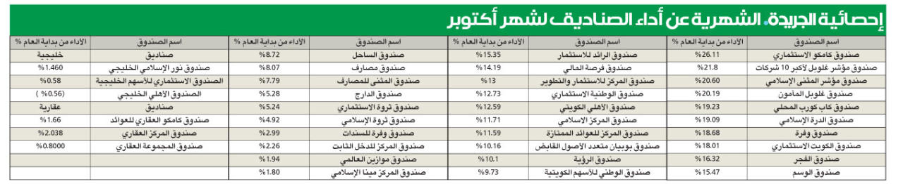 صندوق «كامكو» يحافظ على الصدارة بعائد 26.11% و11 صندوقاً تخطى أداؤها 15%