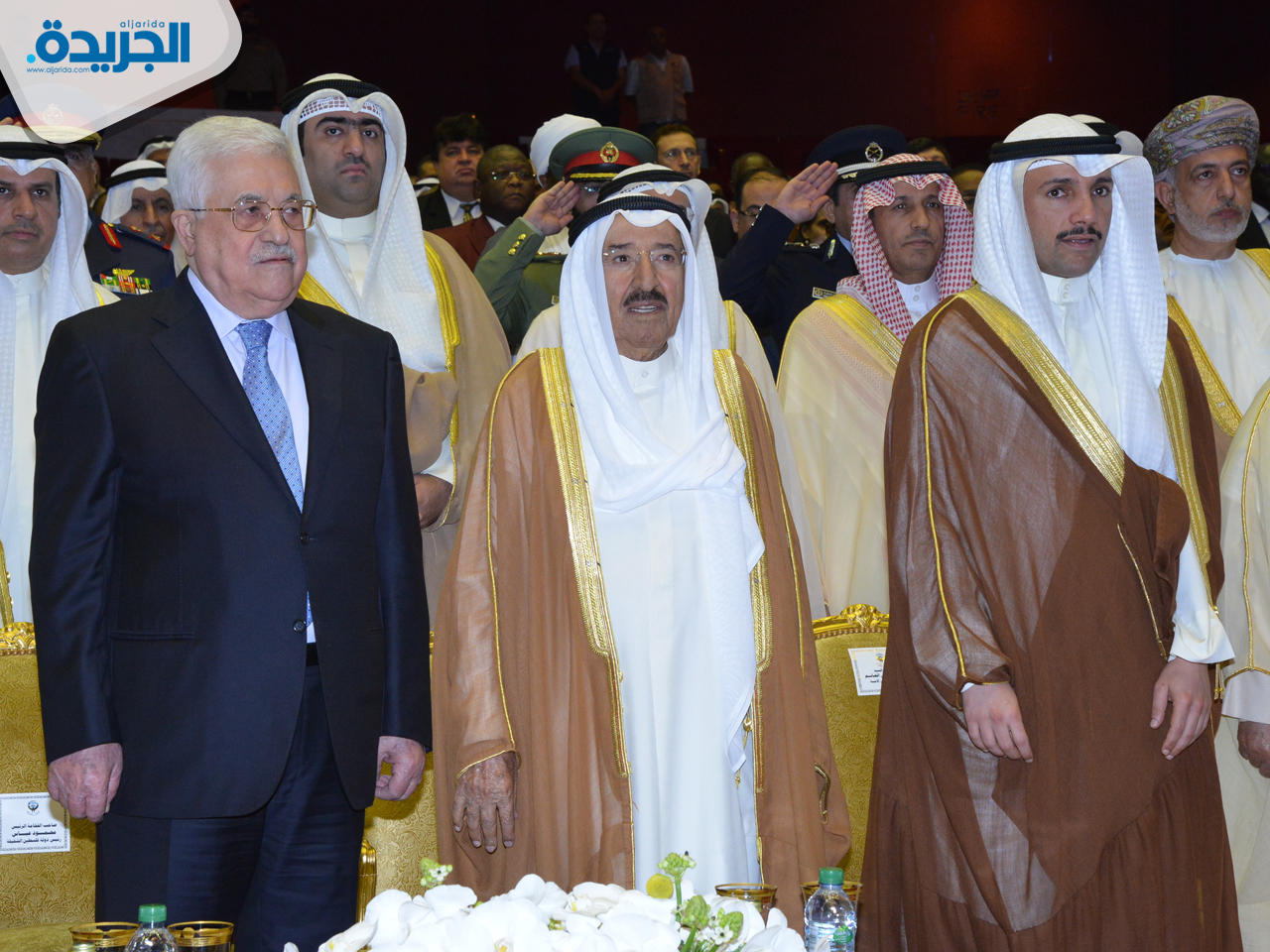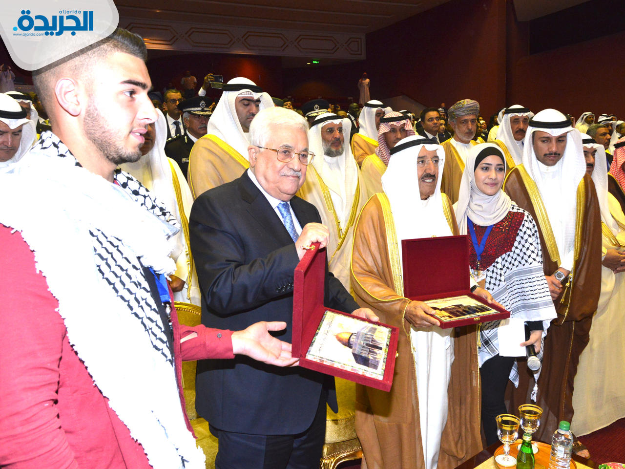 أمير البلاد الشيخ صباح الأحمد والرئيس محمود عباس خلال حفل افتتاح المؤتمر الدولي حول معاناة الطفل الفلسطيني