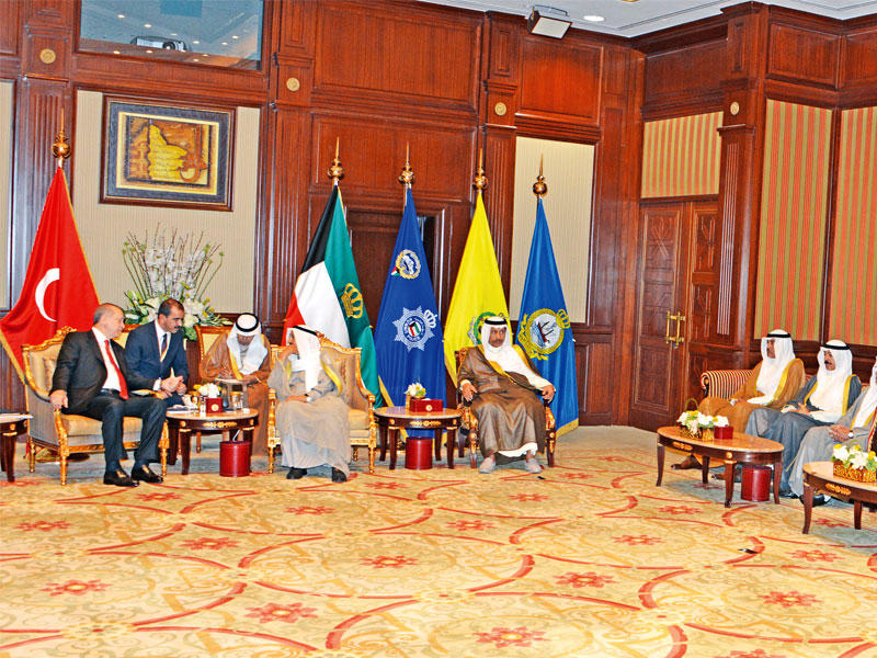 استقبل سمو أمير البلاد الشيخ صباح الأحمد، بقصر بيان ظهر أمس، الرئيس التركي رجب طيب إردوغان والوفد الرسمي المرافق له، وذلك بمناسبة زيارته الرسمية للبلاد.وعقدت المباحثات الرسمية بين الجانبين، إذ ترأس الجانب الكويتي سمو الأمير، وسمو رئيس مجلس الوزراء الشيخ جابر المبارك، والنائب الأول لرئيس مجلس الوزراء وزير الخارجية الشيخ صباح الخالد، وكبار المسؤولين بالدولة، وعن الجانب التركي الرئيس إردوغان وكبار المسؤولين في الحكومة التركية.وصرح نائب وزير شؤون الديوان الأميري، الشيخ علي الجراح، بأن المباحثات تناولت العلاقات الثنائية الراسخة التي تجمع الكويت بالجمهورية التركية وسبل تنميتها وتعزيزها، والسعي لتوسيع أطر التعاون المشترك على كافة الصعد نحو آفاق أرحب، كما تضمنت المباحثات استعراض أبرز القضايا في المنطقة، وآخر المستجدات على الساحتين الإقليمية والدولية.وقد ساد المباحثات جو ودي عكس روح التفاهم والصداقة التي تتميز بها العلاقات الطيبة بين البلدين في خطوة تجسد رغبة الجانبين في تعزيز التعاون القائم بينهما في جميع المجالات.