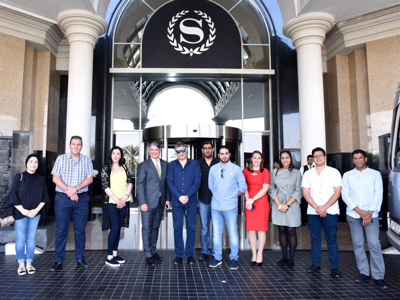 المدير العام لشيراتون مول الإمارات بول دنفي متوسطاً الفريق الإعلامي في لقطة تذكارية