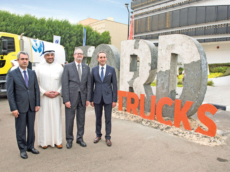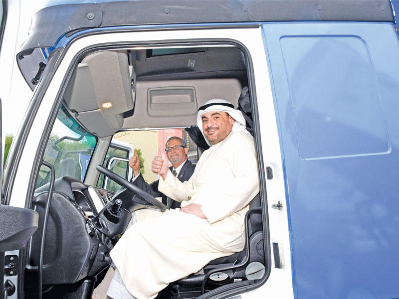 عمر قتيبة الغانم والسفير الأميركي لورنس سيلفرمان في تجربة قيادة لإحدى الشاحنات لأول مرة في الكويت