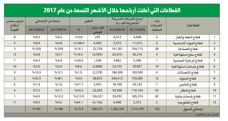 قال تقرير الشال الأسبوعي إن عدد الشركات المدرجة التي أعلنت رسمياً نتائج أعمالها للأشهر التسعة الأولى من العام الحالي بلغ 150 شركة، أو نحو 95.5 في المئة من أصل157 شركة مدرجة، وذلك بعد استبعاد الشركات الموقوفة عن التداول، وتلك التي تختلف سنواتها المالية. وحققت تلك الشركات صافي أرباح بنحو 1.515 مليار دينار، مرتفعاً بنحو 15.9 في المئة عن مستوى أرباح الأشهر التسعة الأولى من عام 2016، لنفس الشركات، والبالغ 1.306 مليار دينار، وعند مقارنة أرباح الربع الثالث من العام البالغة نحو 509.7 ملايين دينار، مع أرباح الربع الثاني لنفس العينة، والبالغة نحو 469.8 مليون دينار، نجدها ارتفعت بنحو 8.5 في المئة، بينما عند مقارنتها مع أرباح الربع الأول، نجدها انخفضت بنحو -4.8 في المئة، ربما بسبب الارتفاع الحاد لأسعار الأسهم في الربع الأول. وحققت 8 قطاعات، من أصل 12 قطاعاً نشطاً، ارتفاعاً في مستوى ربحيتها، عند مقارنة أدائها مع أداء الأشهر التسعة الأولى من عام 2016، أفضلها في ارتفاع الأرباح قطاع الخدمات المالية، الذي زاد مستوى أرباحه من نحو 59.1 مليون دينار إلى نحو 185.4 مليونا، أي بنسبة ارتفاع بلغت نحو 213.9 في المئة، ربما بسبب نشاط البورصة في العام الحالي. وثاني أعلى ارتفاع كان لقطاع المواد الأساسية، الذي زاد مستوى أرباحه من نحو 5.6 ملايين دينار إلى نحو 11.6 مليونا، أي بنحو 108.4 في المئة.وثالثها قطاع الرعاية الصحية، الذي زاد مستوى أرباحه من نحو 3.9 ملايين دينار إلى نحو 5.4 ملايين، أي بنحو 39 في المئة، والقطاعان الأخيران صغيران ومساهمتهما ضئيلة في مجمل أرباح البورصة.