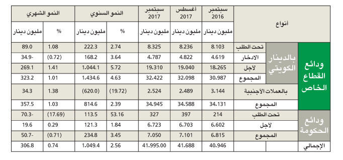 ارتفعت ودائع القطاع الخاص في سبتمبر بنحو 2.4 في المئة، أي ما يعادل 814.6 مليون دينار على أساس سنوي، وصولا إلى 34.9 مليار دينار، مقارنة بـ 34.1 مليارا في سبتمبر 2016.