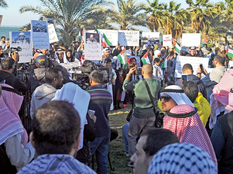احتشد مئات المواطنين والمقيمين في وقفة احتجاجية نظمتها مجموعة من القوى السياسية في ساحة الإرادة، مساء أمس، استنكاراً لإعلان الرئيس الأميركي دونالد ترامب القدس عاصمة لإسرائيل وعزمه نقل السفارة الأميركية من تل أبيب إليها.ووصف المتحدثون قرار ترامب بالجائر والمغتصب للحقوق التاريخية للأمة العربية والإسلامية، مبينين أن الكويت وشعبها لم ولن تطبع في يوم من الأيام، ولا من أي جانب، مع الكيان الصهيوني، وأنها أول من يقف من الشعب الفلسطيني والمحافظة على كيانه، مع التشديد على أن القدس ستبقى عاصمة لفلسطين والدول العربية. في البداية، قال رئيس اللجنة الثقافية في المنبر الديمقراطي مشاري الإبراهيم، إن القرار التعسفي، هو محاولة فاشلة لشطب دولة فلسطين من خريطة العالم، مضيفاً أن المقاطعة الحقيقية لابد أن تكون ضد جميع ما يتعلق بالكيان الصهيوني اقتصادياً وسياسياً، مما سيؤلم هذا الكيان الغاصب، مشيراً إلى أن الكويت بأطيافها أولى الدول، التي وقفت ومازالت تقف مع القضية الفلسطينية، موضحاً أن القدس لن تكون إلا لفلسطين ولن تكون إسرائيلية، وستبقى مهد مقدسات الأمة العربية والإسلامية.