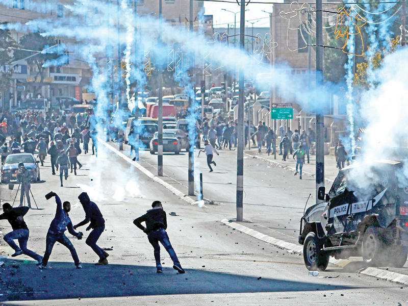 تواصلت المواجهات بين الفلسطينيين والجيش الإسرائيلي، أمس، لليوم الثالث، تنديدا بقرار الرئيس الأميركي دونالد ترامب الاعتراف بالقدس عاصمة لإسرائيل. وفي القدس الشرقية والضفة الغربية وعلى الشريط الحدودي في غزة، تجمع آلاف الفلسطينيين الغاضبين، واشتبكوا مع قوات الأمن الإسرائيلية التي حاولت تفريقهم بالرصاص المطاطي والقنابل الدخانية، مما أدى الى إصابة المئات بجروح، فضلا عن عشرات الإصابات بالاختناق.