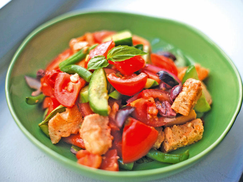 • جهّزي وعاءً من الماء المثلّج. انزعي جذوع اللوبياء وقطعيها إلى قطع بحجم إنشين.• في طنجرة كبيرة، اطبخي اللوبياء في ماء مغلي ومالح لدقيقتين، ثم استعملي ملعقة مثقوبة لنقلها إلى وعاء الماء المثلج. حين تبرد اللوبياء، صفّيها وضعيها جانباً.• ادهني شرائح الخبز بملعقة زيت كبيرة، ثم حمّصيها على المشواة إلى أن تتحمّر واقلبيها مرّة. برّديها قليلاً ثم مزّقي الخبز إلى قطع بحجم إنش.• في وعاء كبير، اخلطي اللوبياء مع الخبز والطماطم والخيار والفلفل الحلو والبصل الأحمر والزيتون والحبق.لتحضير الصلصة: في مرطبان صغير، اخلطي زيت الزيتون مع الخل والخردل والثوم والملح والفلفل والسكر. غطّي المرطبان وحرّكيه كي يمتزج. اسكبي نصف كمية الصلصة فوق خليط الطماطم وحركي المقادير جيداً، ثم اسكبي الصلصة المتبقية فوق خليط الطماطم. غطّي السلطة واتركيها جانباً لنصف ساعة.في موعد تقديم الطبق، حركي السلطة مجدداً ورشّي عليها كمية إضافية من الملح والفلفل عند الحاجة.في الحصة: 175 سعرة حرارية (67% من الدهون)، 13 غراماً من الدهون (غرام من الدهون المشبعة)، 13 غراماً من الكربوهيدرات، غرامان من البروتينات، 304 ملغ من الصوديوم، خالية من الكولسترول، غرامان من الألياف.ملاحظة: يمكنك أن تشوي الفلفل الأحمر بنفسك أو اشتريه في مرطبان.