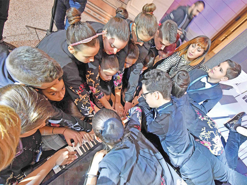 عزف ثمانية عشر مراهقاً بوسنياً وأستاذاهم، الليلة قبل الماضية، على آلة البيانو نفسها، في وضعيات مختلفة، وقوفاً وجلوساً وفي وضعية القرفصاء، لتحطيم رقم قياسي في موسوعة "غينيس".وبعد تدريب لثلاثة أشهر، عزف هؤلاء الشباب مقطوعة "غالو مارش" لألبير لافينياك (1846-1916)، في المكتبة الوطنية بسراييفو التي تعرضت لحريق خلال الغارات، مطلع الحرب الأهلية المحلية (1992 - 1995)، وأعيد بناؤها بعد 22 عاماً.