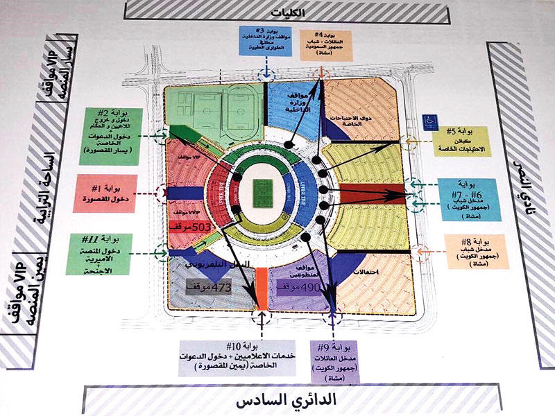 تفتح البوابات ابتداءً من الساعة الواحدة ظهر الجمعةالبوابة (9) لجمهور الكويت للعائلاتوبوابات (8،7،6) مخصصة للشبابالبوابة (4) لجمهور فريق الضيفالبوابة (5) لذوي الاحتياجات الخاصةالبوابة (10) للإعلاميين والمتطوعين والخدماتثلاثة مواقف لمركبات الجمهور