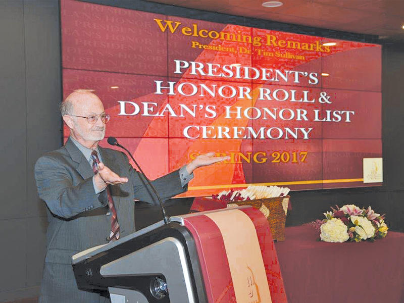 د. سوليفان، بكلمة، عبَّر فيها عن فخره بالإنجازات الأكاديمية للطلاب المتفوقين: "تفتخر الجامعة بجميع الطلبة، بما حققوه وبما سيفعلونه في المستقبل".وبعد افتتاح الحفل، تمت دعوة الطلاب إلى المسرح، لتسلم شهادات التقدير من رئيس الجامعة وعمداء الكليات.