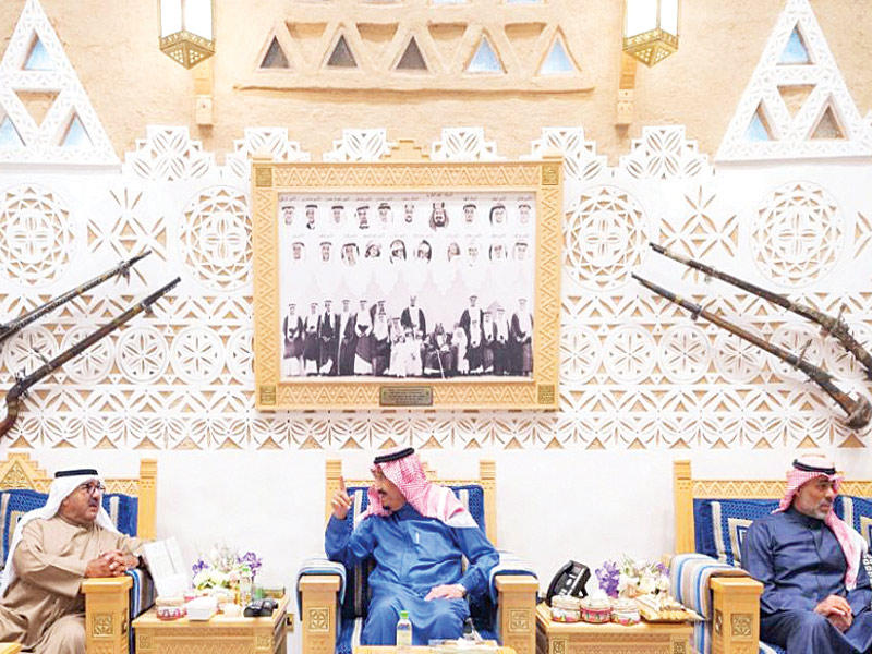 خادم الحرمين خلال استقباله ناصر الصباح في قصر العوجا بالدرعية أمس