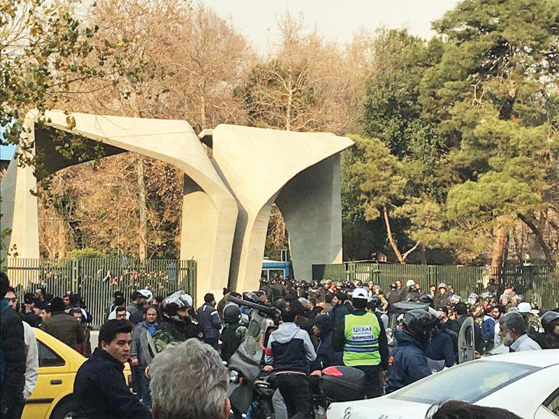 وكان لافتاً أن طلاب جامعات طهران وأميركبير، الذين شكلوا نواة الثورة الإسلامية في إيران خلال حكم الشاه، هم من أطلقوا شرارة التظاهرات في العاصمة، حيث حاصرتهم القوى الأمنية، وعليه لم يتجرأ معظم المارة في شوارع "ولي عصر" وميدان "انقلاب" وسط مدينة طهران على الالتحاق بالطلاب، واكتفوا بالمشاهدة أو تصوير المتظاهرين بهواتفهم.ورغم أن الأجهزة الأمنية حاولت التحكم في التظاهرات عبر محاصرتها فقط، فقد هاجمت في النهاية بعض قادتها وتصادمت مع المتظاهرين واعتقلت بعضهم، كما أوقفت حركة قطارات الأنفاق في مناطق التظاهر فيها بميدان انقلاب (الثورة) ومصلبية ولي عصر ومصلبية كالج، وسط طهران، حيث تقع المراكز الجامعية المشهورة وتعتبر منطقة طلابية.ونظراً إلى احتشاد تظاهرات الجمعة مساء بعد تخفيف الأجهزة الأمنية، فقد زادت السلطات عناصرها مساء أمس، لاسيما في طهران، ولكن مع حلول الليل عادت التظاهرات واشتدت في مدن كرمانشاه وأصفهان وشهركرد ورشت وزنجان.وعلمت "الجريدة"، من مصدر في المجلس الأعلى للأمن القومي، أن الأجهزة الأمنية قدمت مشروعاً بفرض منع التجول الليلي بعد الثامنة مساء، وقطع شبكات التواصل الاجتماعي. وأضاف المصدر أن المجلس أصدر أوامره للأجهزة الأمنية بعدم التصدي للمتظاهرين حتى لو أطلقوا شعارات ضد النظام، على أن يسمح لها بالتدخل المحدود فقط إذا أقدم المتظاهرون على تخريب الأموال العامة.وبالفعل لوحظ أن الأجهزة الأمنية أعلنت، عبر مكبرات الصوت، خصوصاً في المحافظات، أنها تساير الشعب في مطالبه الاقتصادية، لأن الشرطة منه، ولكن يجب على المتظاهرين ألا يخرجوا على الأصول كي لا تضطر الشرطة إلى الاحتكاك بهم.وأفاد بعض المتظاهرين بأن الأجهزة الأمنية كانت تحاول مسايرة المحتجين، وكان عدد من العساكر يتقربون منهم، على أساس أنهم في نفس الخندق، وليسوا أعداء، مع توجيههم إلى الاكتفاء برفع مطالبهم الاقتصادية وتحاشي طرح شعارات سياسية أو معارضة للنظام، وأخبروهم أن هناك مندسين يحاولون معرفة قادة المجموعات الذين يطلقون شعارات ضد المرشد والنظام لاعتقالهم خارج التظاهرات ليلاً، وعملياً كان التصادم بين الأجهزة والمتظاهرين، بعد مساء الجمعة، في أدنى مستوياته.وكان ملحوظاً أن التلفزيون الإيراني اتخذ موقفاً داعماً للاعتراضات الاقتصادية، معتبراً أنها اعتراضات محقة ولكن المتظاهرين يجب أن "ينتبهوا إلى المندسين وعملاء الأعداء بينهم".واعتبر مؤيدو الحكومة، مثل معصومة ابتكار، مساعدة رئيس الجمهورية، وحسام الدين آشنا مستشار الرئيس روحاني، أن موقف الإذاعة والتلفزيون (التابعين لمكتب القائد) يعتبر "تحريضاً للشعب ضد حكومة روحاني".ووسط اتهامات متبادلة، انقسم السياسيون الإيرانيون حيال الاحتجاجات، حيث اتهم أنصار الحكومة معارضيهم بتسيير هذه المسيرات للضغط على روحاني، وأن هذه المسيرات خرجت عن السيطرة، في حين اتهم الأصوليون الحكومة بالتقصير في أدائها، مبينين أن الشعب انتفض ضد روحاني.وشملت الشعارات، التي رُفِعت في المسيرات، جميع شخصيات وأركان النظام من غير الرئيس السابق محمود أحمدي نجاد الذي بدأ مؤيدوه بتشكيل مجموعات في وسائل التواصل تتهم حكومة روحاني بإيصال الوضع الاقتصادي إلى ما هو عليه اليوم، مع مهاجمة المرشد على أساس أنه لم يستمع إلى كلام أحمدي نجاد الذي أخطره بما يحصل في الشارع.وقام محسن أراكي، رئيس منظمة تقريب المذاهب، الذي كان يتكلم بالنيابة عن المرشد أمام الجمهور المؤيد للنظام في مصلى الإمام الخميني بوسط طهران، بمطالبة الحكومة بالانسحاب من الاتفاق النووي ووقف تنفيذه، على أساس أنها دخلت هذه المفاوضات لوقف الضغوط الاقتصادية، ولكن الطرف المقابل لم ينفذ وعوده، وكل ما تواجهه البلاد من مشاكل اقتصادية أساسها عدم إيفاء الطرف المقابل بتعهداته. واتهم أراكي الحكومة بمخالفة أوامر المرشد بتسيير "الاقتصاد المقاوم"، معتبراً أن البلاد ما كانت لتواجه المشاكل الاقتصادية الفعلية لو أن حكومة روحاني امتثلت لت