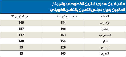 في السياق، تكشف المقارنة بالفلس الكويتي، بين أسعار البنزين 95 و91 في دول مجلس التعاون، أن أسعار الإمارات هي الأغلى بـ184 فلساً للأول و169 للثاني، تليها عمان بـ166 و157، ثم السعودية بـ163 و112، ثم قطر بـ154 و148، ثم البحرين بـ126 و99، أما الكويت فتبقى الأقل بـ105 و85 فلساً.
