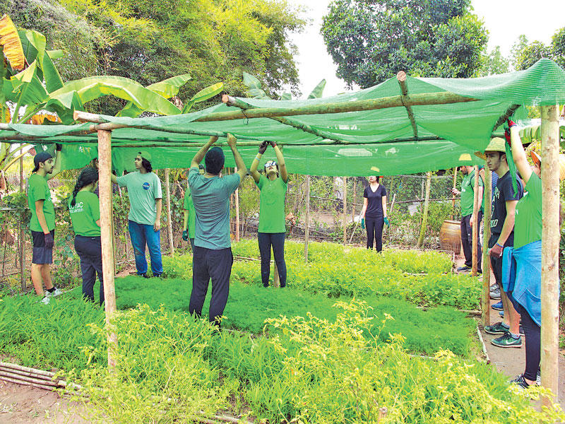 متطوعو «لوياك» أثناء بناء محميات في المزارع العضوية للحفاظ على المنتجات والثمار الصحية