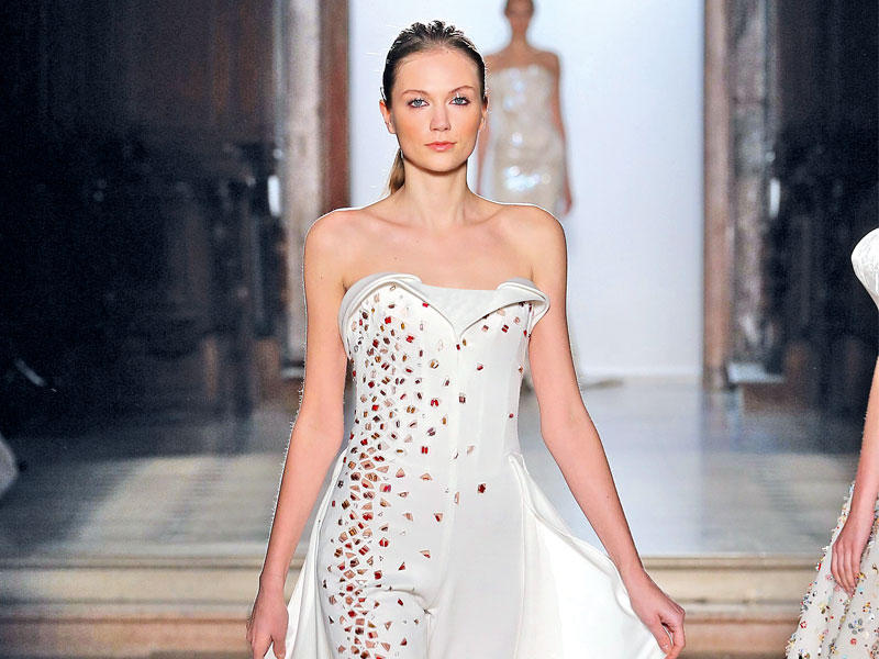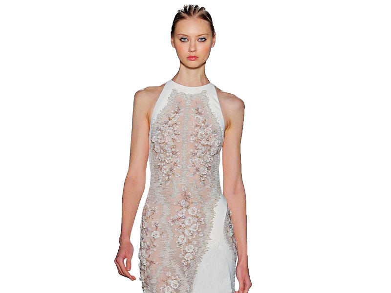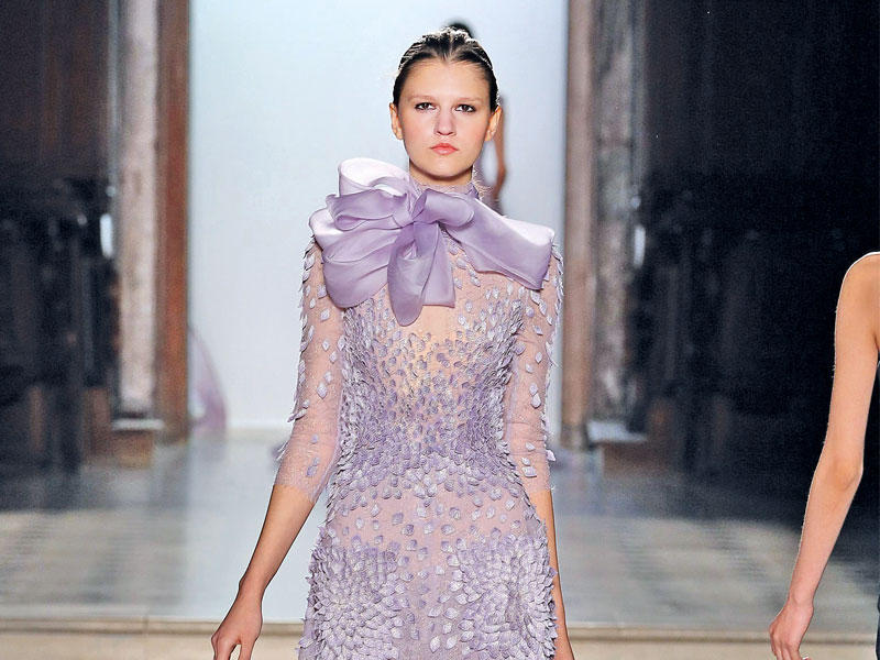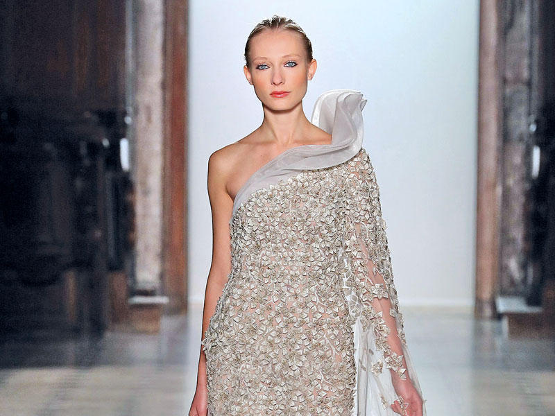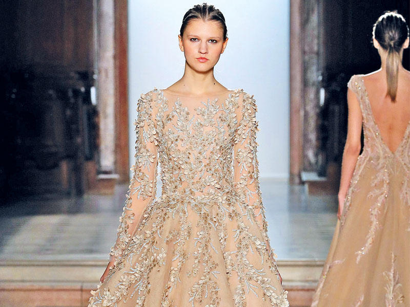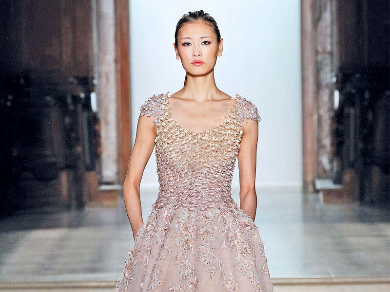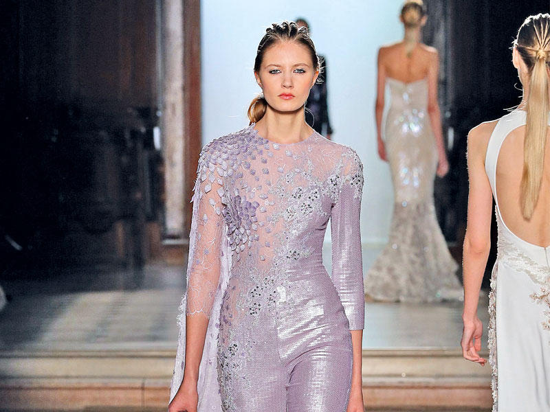 اللافت أن الأشكال المتكررة مشغولة يدوياً بحرفية على الفساتين المصنوعة من الحرير والأورغانزا والتول المطرز، إضافة إلى الساتان المقطع. أما الألوان فتتراوح بين الزهري، والأرجواني، والأخضر الفاتح، والأبيض الكريمي؛ ما يبعث الضوء في المجموعة ويضفي عليها إحساساً صيفياً منعشاً.