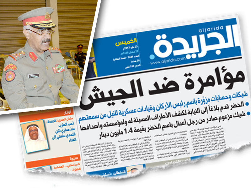 وكانت النيابة تلقت، قبل نحو عام، بلاغاً من الخضر، وتبعه آخر من عدد من ضباط الجيش، للتحقيق في وجود شيكات غير صحيحة صادرة بأسمائهم على أنها مقابل صفقات يتم تمريرها بما يخالف قانون حماية الأموال العامة، وذلك للإضرار بسمعتهم.