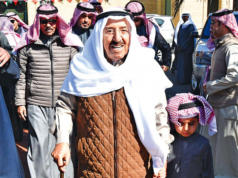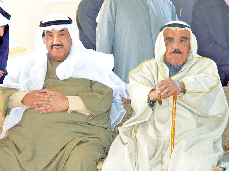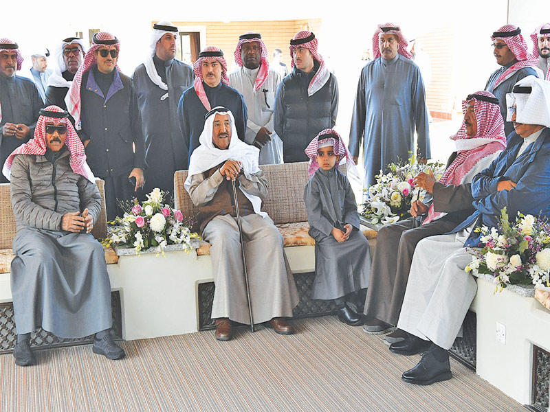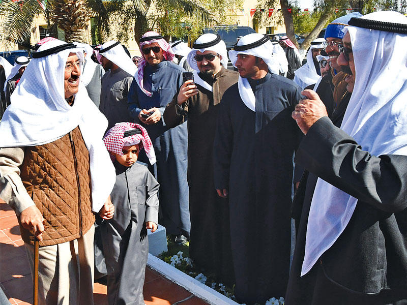 سمو الأمير وسمو ولي العهد لدى وصولهما إلى عزايز... ويبدو برفقة صاحب السمو حفيده محمد حمد الصباح