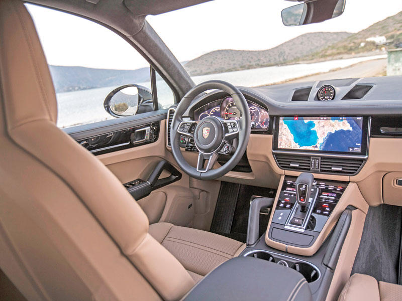 وبالانتقال إلى الداخل، أفضل ما يمكن أن تتمتع "كاين" الجديدة بصندوق أمتعة أكبر بمقدار مئة لتر ومقصورة رحبة تحظى بالعديد من مزايا الراحة والعملية عبر أرجائها.ويوثق مفهوم "مقصورة قيادة بورشه المتطورة" Porsche Advanced Cockpit الرابط بين السيارة والركاب من خلال قدرة اتصال أفضل وأسلوب تحكم بديهي.في هذا السياق، ثمة كونسول وسطي بتقنية "التحكم باللمس المباشر"Direct Touch Control وشاشة لمسية جديدة قياس 12.3 بوصات، خاصة بـ "نظام بورشه لإدارة الاتصالات" PCM، هما بمنزلة وحدة تواصل بين السائق ووظائف السيارة كافة. ويمكن ضبط "نظام بورشه لإدارة الاتصالات" لتوفير 6 أنماط فردية تخزن عددا كبيرا من الإعدادات الداخلية، إضافة إلى إعدادات الإضاءة وبرامج القيادة وأنظمة المساندة.محرك وتروس
