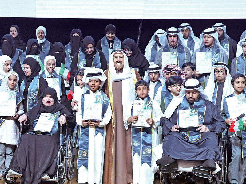 برعاية وحضور صاحب السمو أمير البلاد الشيخ صباح الأحمد أقيم امس الحفل الختامي لتكريم الفائزين والفائزات في مسابقة الكويت الكبرى لحفظ القرآن الكريم وتجويده الحادية والعشرين وذلك على مسرح قصر بيان.ووصل سموه إلى مكان الحفل حيث استقبل بكل حفاوة وترحيب من قبل وزير العدل وزير الأوقاف والشؤون الإسلامية الدكتور فهد العفاسي.وشهد الحفل سمو ولي العهد الشيخ نواف الأحمد ورئيس مجلس الوزراء سمو الشيخ جابر المبارك ورئيس المجلس الأعلى للقضاء ورئيس محكمة التمييز ورئيس المحكمة الدستورية المستشار يوسف المطاوعة ورئيس مجلس الأمة بالإنابة عيسى الكندري وكبار المسؤولين بالدولة.وبدأ الحفل بالنشيد الوطني ثم تلا أحد الفائزين بالمسابقة آيات من الذكر الحكيم وألقى وزير العدل وزير الأوقاف والشؤون الإسلامية كلمة بالمناسبة حيا في مستهلها صاحب السمو والمشاركين وقال إن «تفضلكم يا صاحب السمو برعاية المسابقة وتتويجها بتوجيهاتكم السامية لتحفيظ القرآن الكريم وتشريفها بحضور سموكم حفل تكريم الفائزين في كل عام لهو توفيق من الله تعالى أجرى به الخير على يديكم لتكون في مقام القدوة الحسنة في العمل من أجل عزة الإسلام ونصرة المسلمين».