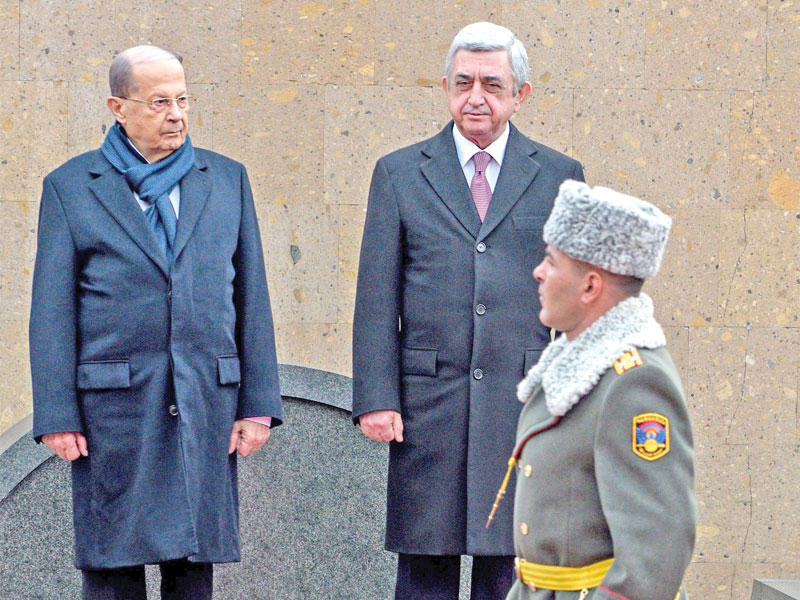وقال عون، في مستهل المؤتمر المشترك: «تطرقت المحادثات إلى التهديدات الإسرائيلية للبنان، من بوابة حقوقه النفطية في المنطقة الاقتصادية الخالصة، وإقامة حائط فاصل يصل الى نقاط متنازع عليها عند حدودنا الجنوبية. وأكدت له أن لبنان متمسك بحدوده البرية والبحرية، وبحقه في الدفاع عنها بكل الوسائل المشروعة، وأننا نعول على صداقاتنا الدولية للمساعدة في جبه هذه التهديدات وعدم تفاقم الأوضاع».وأضاف: «تطرقنا أيضا الى الأوضاع في منطقة الشرق الأوسط، والأزمات والحروب المشتعلة في عدد من بلدانها، وخصوصا في سورية المجاورة لبلدنا. واتفقنا على ضرورة ايجاد حلول سلمية لهذه الأزمات، وايقاف آلة الحرب، لأن العنف لا يستجر إلا العنف والتطرف، وهذا ما برهنت عليه السنوات السبع الأخيرة منذ اندلاع الاضطرابات في منطقتنا». كما التقى عون، أمس، رئيس مجلس النواب الارميني آرا بابلويان.في سياق منفصل، عادت قضية رنى قليلات وبنك «المدينة» إلى الواجهة من جديد، لكنها المرّة الأولى التي تكشف فيها بهذه الدقة عن تفاصيل تُورط أسماء نواب ووزراء بارزين فيما عرف بـ«فضيحة بنك المدينة»، من بينها رئيس حزب «التوحيد العربي» الوزير السابق وئام وهاب. وكشفت قليلات، في حديثها لمجلة «الشراع»، أن «من بين الأسماء البارزة النواب والوزراء السابقين: كريم بقرادوني، ناصر قنديل، وئام وهاب، أسعد حردان، رشاد سلامة، ميشال الحلو، مروان خير الدين، وإميل إميل لحود الذي تولى بنك المدينة كافة تكاليف عرسه، وغيرهم».