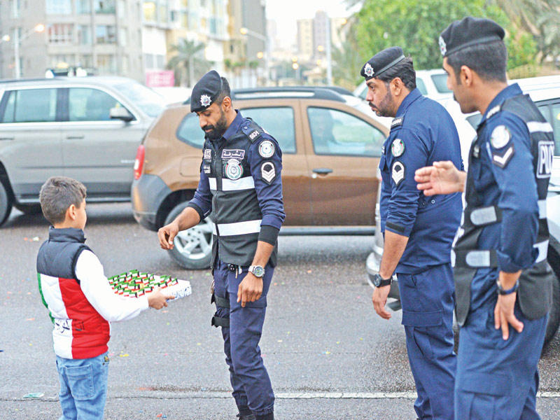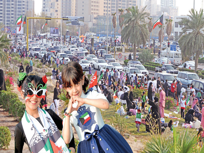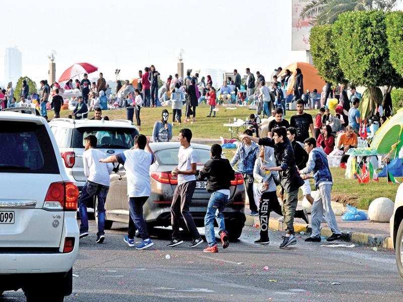 عمت مظاهر الاعياد الوطنية اجواء الكويت أمس حيث شهدت بعض المناطق لا سيما شارع الخليج والواجهة البحرية ازدحاما كبيرا للمواطنين والمقيمين مستفيدين من تحسن الطقس للاحتفال بالمناسبات الوطنية.وعلى الرغم من مخاطر الظاهرة استمرت رشاشات وبالونات المياه العنصر الابرز للاحتفالات لا سيما بالنسبة الى الاطفال الذين انتشروا على جوانب شارع الخليج وبعض شوارع الاكتظاظ المروري لرش السيارات بالمياه دون اي اعتبار لمخاطر ملاحقة الاطفال للسيارات حتى عرض الشوارع.
