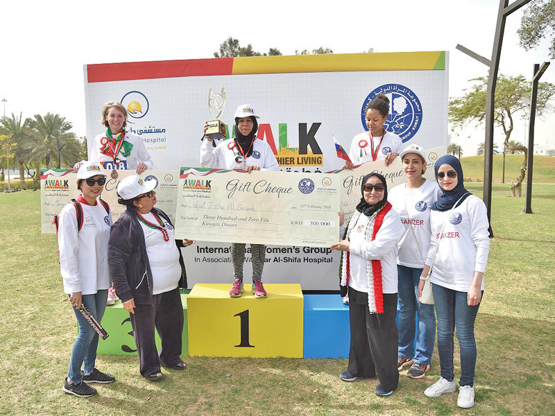 أقام مستشفى دار الشفاء، بالتعاون مع مجموعة المرأة الدولية في الكويت، مسابقة المشي "خطوة نحو حياة صحية"، الأربعاء الماضي، في حديقة الشهيد، احتفالا بحلول الأعياد الوطنية في الكويت.وشارك في مسابقة المشي عدد كبير من سيدات المجتمع، وعلى رأسهن نرجس اليوسفي عضوة مجلس الإدارة في مستشفى دار الشفاء، ونرجس الشطي مديرة العلاقات العامة في مجموعة المرأة الدولية، وزوجات السفراء والممثلين الدبلوماسيين من مختلف البلدان العربية والأجنبية داخل الكويت، إضافة إلى عضوات مجموعة المرأة الدولية في الكويت.وبدأ السباق في العاشرة صباحا، وبلغت مسافته 5 كيلومترات، بعد أن قامت المشتركات في صباح نفس اليوم بالتسجيل واستلام الملابس والأرقام التي تخول لهن المشاركة في السباق. وشهدت الساحة المحيطة بالسباق تقديم عدد من الخدمات الصحية لقياس ضغط الدم، نسبة السكر في الدم، الوزن والطول، إضافة إلى استشارات مجانية قدمها قسم التغذية العلاجية بالمستشفى، كما تواجدت سيارة الإسعاف التابعة لمستشفى دار الشفاء طوال مدة المسابقة تحسباً لأي حالة طارئة.