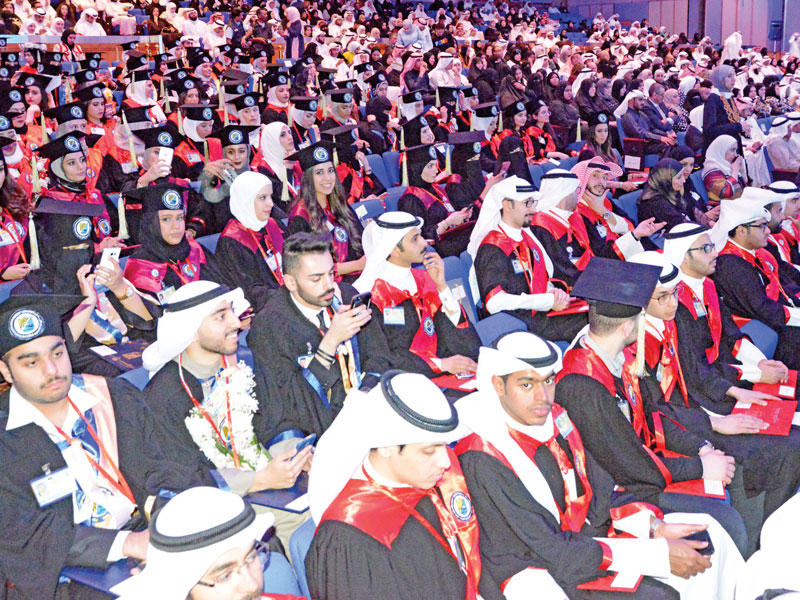 برعاية وحضور سمو أمير البلاد الشيخ صباح الأحمد، أقيم صباح أمس حفل توزيع شهادات الإجازة الجامعية والدراسات العليا على خريجي الجامعة المتفوقين للعام الجامعي 2016 /2017، وذلك على مسرح المغفور له الشيخ عبدالله الجابر بمنطقة الشويخ.وحضر الحفل سمو ولي العهد الشيخ نواف الأحمد، ورئيس مجلس الأمة مرزوق الغانم، ورئيس مجلس الوزراء سمو الشيخ جابر المبارك، وكبار المسؤولين بالدولة، وجمع غفير من أهالي الطلبة الخريجين والمواطنين.وخلال الحفل، قال وزير التربية وزير التعليم العالي الرئيس الأعلى للجامعة د. حامد العازمي إن "رعاية سموكم للجامعة وأبنائها فيها دلالة على ما يكنه قلبكم الكبير من حب لابناء هذا الوطن، وحرص على مستقبلهم، كما انها حافز كبير لهم على التمسك بروح الاسرة الواحدة والتفاني في خدمة الوطن الذي يقدم لأبنائه بتوجيه من سموكم ما يكفل لهم الحياة السعيدة والعيش الآمن".