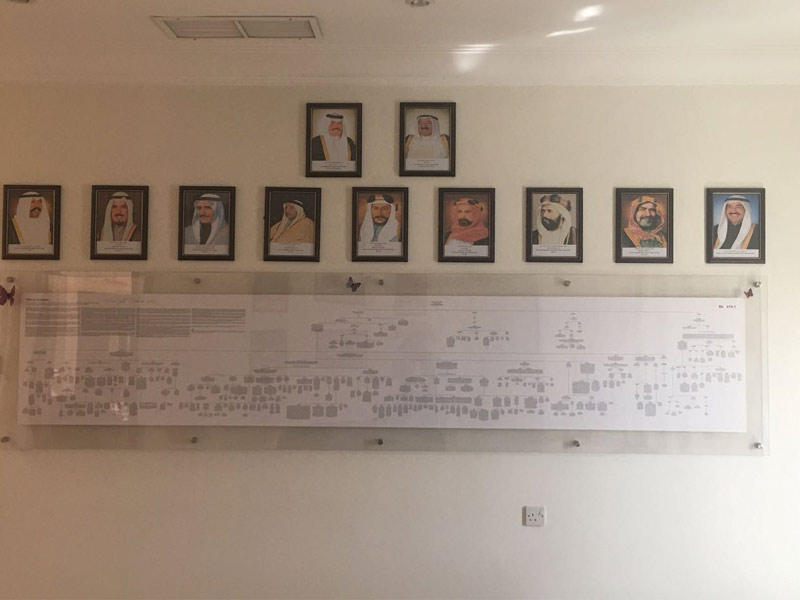 في الطابق الثاني بمبنى السفارة، وضع السفير شمير علي شجرة عائلة الصباح من تصميم المؤرخ البريطاني مايكل فيلد.استقبال سارة