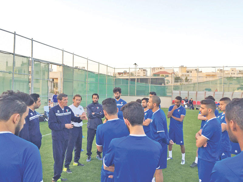 وكان وفد المنتخب قد غادر البلاد في التاسعة والنصف من صباح أمس متوجها إلى عمان، برئاسة رئيس لجنة التسوية المكلفة بإدارة شؤون اتحاد الكرة د. مشعل الشاهين الربيّع، بالإضافة إلى أعضاء الجهازين الفني والإداري و23 لاعبا لم يتخلف منهم أحد عن المغادرة، وكان في استقبال الوفد بالمطار مسؤولون من الاتحاد الأردني لكرة القدم.ويقيم وفد المنتخب في فندق لاند مارك بالعاصمة عمان، وقد أشاد أعضاء الوفد بالفندق الذي لا يبعد عن ملعب خريبة السوق، الذي خاض الأزرق تدريبه الأول عليه في الخامسة والنصف من مساء أمس إلا دقائق معدودة.وشهد التدريب الأول للأزرق تنفيذ اللاعبين لبعض الجمل الفنية والتكتيكية، ثم إجراء تقسيمة بينهم استمرت نحو نصف ساعة، والتي شهدت تطبيق ما تدرب عليه اللاعبون.