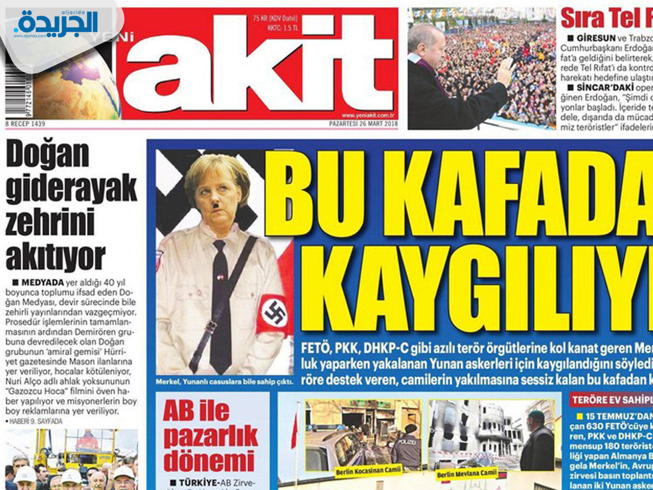 نشرت صحيفة تركية الاثنين على صفحتها الاولى صورة مركبة تظهر المستشارة الالمانية انغيلا ميركل بشاربي ادولف هتلر وترتدي زيا نازيا، آخذة على المستشارة الالمانية توجيه انتقادات لانقرة.وتذكر هذه الصورة باخرى نشرتها قبل عام صحيفة "غونيش" الموالية للحكومة في ذروة التوتر بين المانيا وتركيا ولم يتردد في حينها الرئيس رجب طيب اردوغان باتهام القادة الالمان باللجوء الى "اساليب نازية" ما اثار غضب برلين.وعنونت صحيفة "يني اكيت" المحافظة والموالية للحكومة الاثنين "هذه العقلية تقلقنا" مشيرة الى ان ميركل "لا تفوت فرصة للادلاء بتصريحات ضد تركيا".ودانت الصحيفة خصوصا الدعوة التي نسبت الى ميركل للافراج عن جنديين يونانيين اعتقلا بعد دخولهما الى الاراضي التركية اثناء القيام بدورية على الحدود في قضية زادت التوتر في العلاقات بين انقرة والاتحاد الاوروبي.