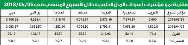 جاءت بداية تعاملات الربع الثاني من العام الحالي في أسواق المال في دول مجلس التعاون الخليجي متباينة بشدة، وسجلت مؤشراتها اختلافا واضحا، وذلك من خلال محصلة الاسبوع الاول من هذا الربع، حيث انقسمت بين 4 مؤشرات رابحة ومتفاوتة، من حيث نسب النمو، تصدرها مؤشر سوق قطر بنسبة 2.6 في المئة، تلاه ثانيا مؤشر سوق أبو ظبي رابحا 2.2 في المئة، وحل "تاسي" السعودي الرئيسي ثالثا بنمو بلغ 1 في المئة، في حين اكتفى مؤشر سوق مسقط بنصف نقطة مئوية، بينما كانت الخسارة الأكبر لمؤشر السوق العام الكويتي الجديد، بنسبة 3.6 في المئة، وكانت الخسارة الثانية من نصيب سوق المنامة بنسبة كبيرة بلغت 2.7 في المئة، وتراجع مؤشر دبي بنسبة 0.8 في المئة.