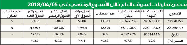 تراجع مؤشر السوق الكويتي العام الجديد بنسبة كبيرة في أسبوعه الأول بلغت 3.6% تعادل 179.2 نقطة، ليتراجع إلى مستوى 4820.8 نقطة، وكان الضغط مزدوجاً من مؤشر السوق الأول الذي خسر 4.1% تعادل 206.5 نقاط، وخسر السوق الرئيسي نسبة 2.6%