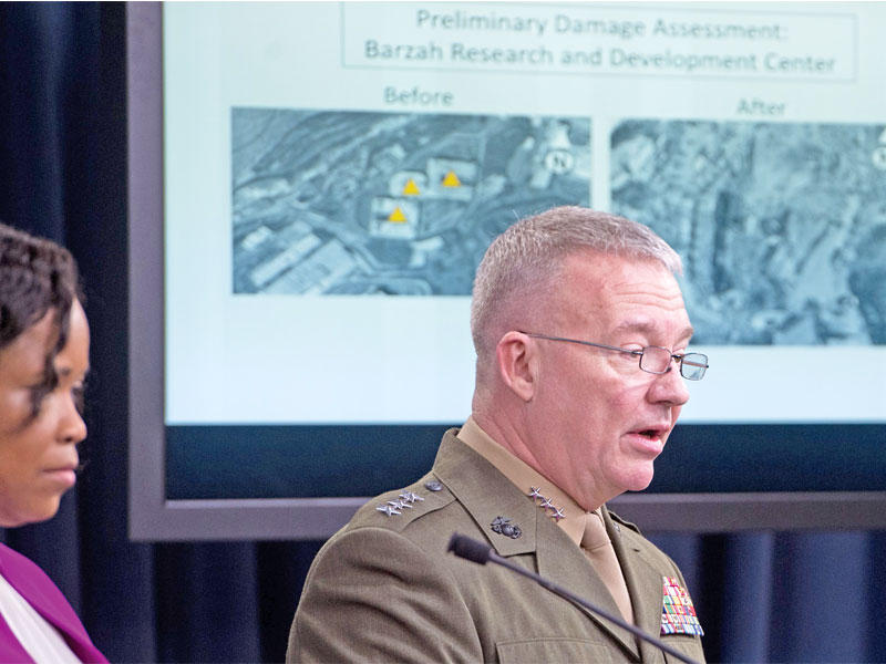 مؤتمر صحافي للمتحدثة باسم «البنتاغون» دانا دبليو وايت ومدير هيئة الأركان كينيث إف. ماكنزي جونيور في واشنطن أمس (أ ف ب)