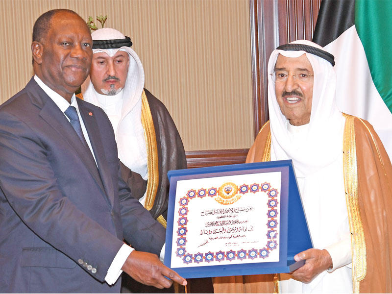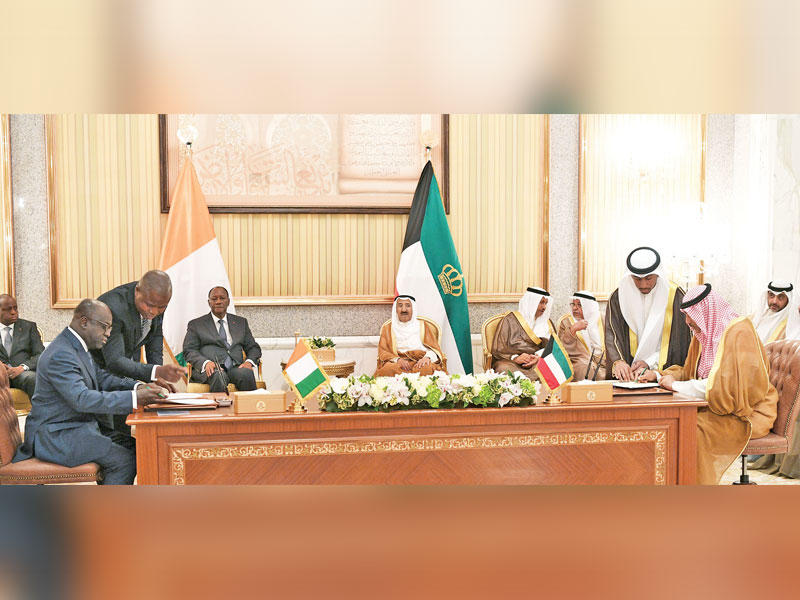 وساد المباحثات جو ودي عكس روح التفاهم والصداقة، التي تتميز بها العلاقات الطيبة بين البلدين، في خطوة تجسد رغبة الجانبين في تعزيز التعاون القائم بينهما في كل المجالات. وبحضور صاحب السمو والرئيس واتارا وسمو رئيس مجلس الوزراء تم بقصر بيان، ظهر أمس، التوقيع على اتفاقية بين الكويت وجمهورية كوت دي فوار وهي كما يلي:1 - اتفاقية بين حكومة الكويت وحكومة كوت دي فوار بشأن إنشاء لجنة كويتية – إيفوارية مشتركة للتعاون.2 - مذكرة تفاهم بين وزارة خارجية الكويت ووزارة خارجية كوت دي فوار بشأن إقامة المشاورات الثنائية. 3 - مذكرة تفاهم بين الصندوق الكويتي للتنمية الاقتصادية العربية وحكومة كوت دي فوار.ووقعها عن حكومة الكويت نائب رئيس مجلس الوزراء وزير الخارجية الشيخ صباح الخالد وعن حكومة جمهورية كوت دي فوار وزير الشؤون الخارجية مارسيل آمون تاتوه. وتبادل سمو الأمير ورئيس جمهورية كوت دي فوار الأوسمة، إذ قلد سموه واتارا قلادة مبارك الكبير تقديراً من الشعب الكويتي له وتقديراً لموقف كوت دي فوار المؤيد لقضايا الكويت خصوصاًوالقضايا الإنسانية عموماً.وقلد واتارا سموه «الوسام الوطني للجدارة» والذي يعد أعلى وسام في جمهورية كوت دي فوار وذلك تقديرا لدور سموه الرائد في مجال القضايا الإنسانية. وأقام صاحب السمو بقصر بيان، ظهر أمس، مأدبة غداء على شرف الرئيس واتارا والوفد الرسمي المرافق له، بمناسبة زيارته الرسمية للبلاد.واتارا استقبل الغانم والمحمد و«الغرفة» و«صندوق التنمية»