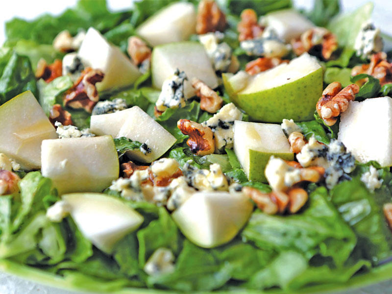 • رأس خس روماني.• إجاصتان مفرومتان.• 110 غرامات من جبنة ستيلتون أو أي جبنة زرقاء مفتتة.• ¾ كوب من الجوز المحمّص.• نصف كوب من صلصة الخل.الطريقة: