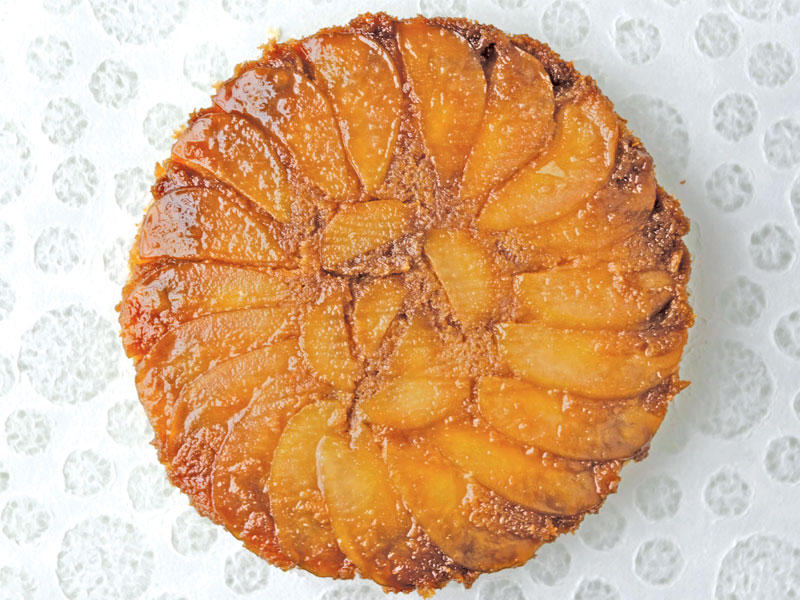 • سخني الفرن مسبقاً على حرارة 175 درجة مئوية. ادهني قالب حلوى بالزبدة ووزعي فيه ورق البرشمان.• اسكبي الطحين ودقيق الذرة ومسحوق الخبز والملح في وعاء صغير. ضعي الخليط جانباً. • ذوّبي 4 ملاعق كبيرة من الزبدة في مقلاة صغيرة على نار متوسطة أو خفيفة، ثم أضيفي السكر الأسمر وحرّكيه إلى أن يمتزج جيداً. اسكبي الخليط في القالب المحضّر ووزعيه كي يغطيه كله.• قشّري الإجاص وقطّعيه إلى النصف وانزعي بذوره، ثم قطّعيه بالطول إلى شرائح بحجم 8 إنشات ووزعيه فوق الكراميل بشكل دائري ومتداخل عند الحاجة.• اخلطي حبيبات السكر مع الملاعق المتبقية من الزبدة والفانيلا في وعاء كبير، ثم اخفقي الخليط بسرعة متوسطة في الخلاط الكهربائي لثلاث دقائق إلى أن يصبح خفيفاً. أضيفي صفار البيض بشكل متلاحق واخفقي الخليط كي يمتزج بين الإضافات واكشطي طرف الوعاء بمجحاف، ثم اسكبي خليط الطحين على ثلاث دفعات واستبدلي به الحليب مرتين. ابدئي بخليط الطحين وانتهي به.• استعملي مخفقة نظيفة وجافة لخفق زلال البيض بسرعة متدنية في وعاء متوسط إلى أن تتشكّل رغوة. زيدي السرعة وتابعي خفق الخليط إلى أن تتشكل كتل لينة، ثم اسكبي ربع الزلال تقريباً فوق خليط العجينة، وأضيفي الزلال المتبقي وحركيه كي يمتزج. اسكبي خليط العجينة فوق الإجاص في القالب وملّسي سطحه.• اخبزي الحلوى وحركيها في منتصف مدة الطبخ إلى أن يتحمّر سطحها، بين 55 دقيقة وساعة. برّديها في القالب على أحد الرفوف طوال 30 دقيقة. مرري سكيناً رفيعة داخل القالب لفصل الحلوى. ملاحظة: يمكنك تحضير الوصفة حتى هذه المرحلة في اليوم السابق. خزّني قالب الحلوى على حرارة الغرفة.• اقلبي الحلوى فوق طبق. انزعي ورق البرشمان وقدّمي الحلوى دافئة أو على حرارة الغرفة مع كريما مخفوقة أو مثلجات الكراميل.في الحصة (من أصل 8): 419 سعرة حرارية، 19 غراماً من الدهون، 11 غراماً من الدهون المشبعة، 94 ملغ من الكولسترول، 4 غرامات من البروتينات، 59 غراماً من الكربوهيدرات، 44 غراماً من السكر، غرامان من الألياف، 197 ملغ من الصوديوم، 72 ملغ من الكالسيوم.