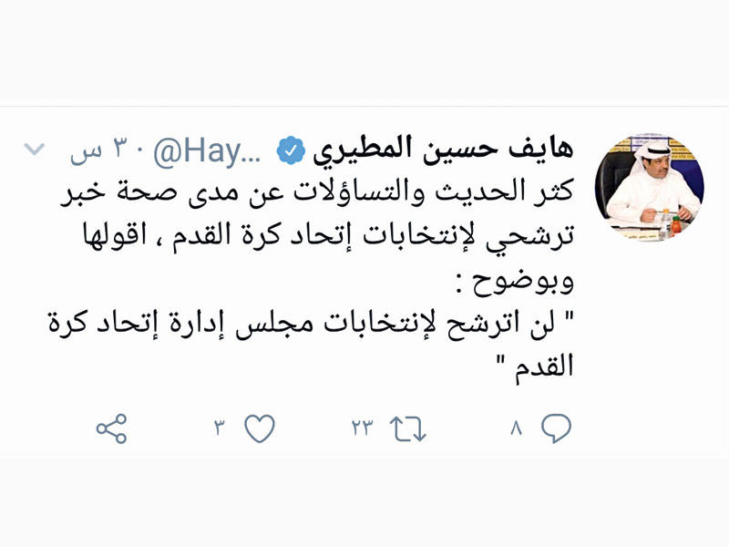 تراجع هايف المطيري عن خوض انتخابات اتحاد الكرة، ليتقدم شقيقه علي بأوراق ترشحه، بينما تقدم الشقيقان سالم وفلاح سعدون بأوراقهما لمجلس إدارة التضامن، وفهد المطيري لمجلس إدارة خيطان.