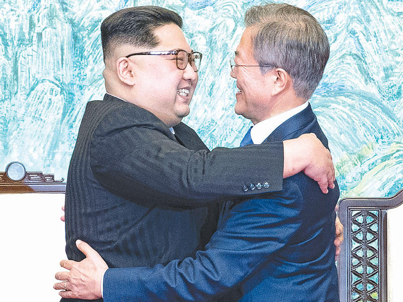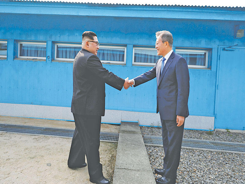 بتبادل الابتسام والتصافح بالأيدي، التقى زعيم كوريا الشمالية كيم جونغ أون ورئيس كوريا الجنوبية مون جي إن، في المنطقة منزوعة السلاح شديدة التحصين بين البلدين، أمس، وتعهدا بالسعي لتحقيق السلام بعد عقود من النزاع، ووقع الزعيمان إعلاناً يتضمن الموافقة على العمل من أجل "نزع السلاح النووي بالكامل من شبه الجزيرة الكورية".