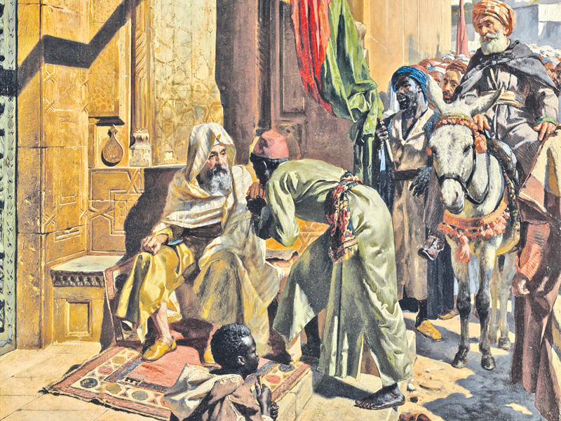 ولم يزل سائراً حائراً، يحدِّث نفسه قائلاً: هل هذا المولود خلقه الله من غير رزق؟ كلا! إن هذا لا يكون أبداً، لأن الذي شق الأشداق، تكفل لها بالأرزاق، ولما وصل في طريقه إلى الفرن الذي تعود شراء الخبز منه كل يوم، وجد الناس حوله في زحام شديد، لأن الغلاء كان فاشياً في ذلك الحين، والمال قليل في أيدي الناس، وكلهم يشكون قلة المؤونة. كان الخباز وعماله يظهرون الضيق بالمزدحمين ويزجرونهم زجراً شديداً طالبين منهم السكوت، بينما يأخذون ثمن الخبز المطلوب من كل منهم مقدماً، فقال الصياد لنفسه: إذا كان هذا حال من يشترون الخبز بالنقد، فكيف يكون حالي إن طلبت خبزاً على أن أدفع ثمنه في ما بعد؟ وترامت إلى أنفه رائحة الخبز الساخن، فشعر بالجوع وتذكر حال زوجته الوالدة الضعيفة وأولاده الذين ينتظرون عودته إليهم بالطعام، فانهمرت الدموع من عينيه، ووقف في آخر الصفوف مطرقاً حائراً لا يدري ما يفعل.وحانت من الخباز التفاتة إلى الجهة التي وقف فيها الصياد المسكين، فعرفه بالشبكة التي على كتفه، وأدرك أنه في حاجة إلى خبز وليس معه فلوس، فأشفق عليه، وتوجه إليه حاملاً عدداً كبيراً من الأرغفة، ثم أعطاه إياها وقال له: لا تيأس من رحمة الله يا صياد، خذ هذا الخبز لعيالك، وهذه عشرة دراهم أيضاً كي تشتري ما يحتاج إليه البيت من اللحم والخضراوات وغيرها!