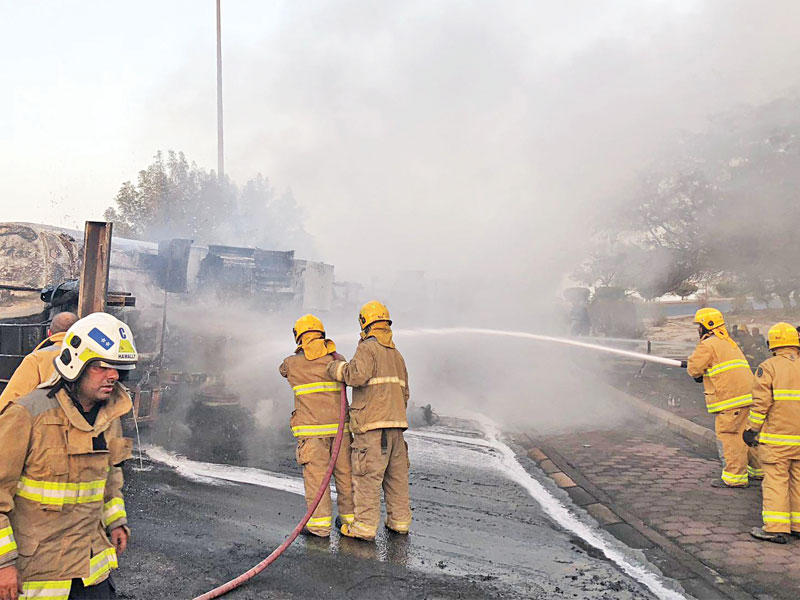 أصيب وافد آسيوي بجروح خطيرة نقل على إثرها إلى المستشفى لتلقي العلاج، وتعطلت حركة السير على الوصلة المؤدية من طريق المطار لطريق جاسم الخرافي (السادس) مقابل مجمع 360، من جراء حادث انقلاب صهريج نقل وقود البنزين قبل الإفطار، مساء أمس الأول.وفي التفاصيل، قال مدير إدارة العلاقات العامة والإعلام بالإدارة العامة للاطفاء العقيد خليل الأمير، إن «غرفة عمليات الإدارة تلقت بلاغا يفيد بانقلاب صهريج كبير مخصص لنقل الوقود على طريق الدائري السادس»، مشيرا إلى أنه «فور تلقي البلاغ تم تحريك مراكز اطفاء الفروانية، وصبحان، ومبارك الكبير، والإسناد بقيادة نائب المدير العام لشؤون قطاع المكافحة اللواء جمال البليهيص، وبمتابعة المدير العام للإدارة الفريق خالد المكراد».