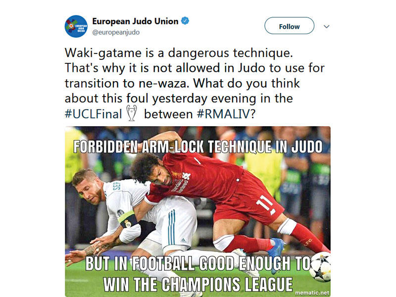 من جانب آخر، أكد اتحاد الجودو الأوروبي أن الحركة التي قام بها راموس ضد صلاح ممنوعة في لعبة الجودو، إذ علق عبر حسابه الرسمي في «تويتر»، على صورة تظهر التحام اللاعبَين: «حركة Waki-gatame، هي أسلوب خطير، لهذا يمنع استخدامها في رياضة الجودو... ما رأيك أن هذا الأسلوب استخدم في نهائي دوري أبطال أوروبا السبت الماضي؟».