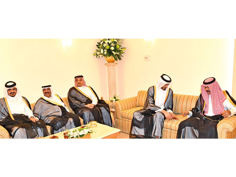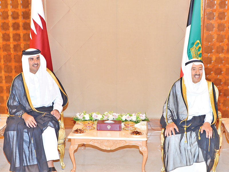 استقبل صاحب السمو أمير البلاد الشيخ صباح الأحمد بقصر دسمان عصر امس الاول أمير دولة قطر الشقيقة الشيخ تميم بن حمد بن خليفة آل ثاني والوفد الرسمي المرافق له بحضور سمو ولي العهد الشيخ نواف الأحمد حيث قدم لسموه التهاني بمناسبة شهر رمضان المبارك.وتم خلال اللقاء تبادل الأحاديث الودية الطيبة حول مجمل الأمور التي عكست عمق العلاقات الأخوية الطيبة والراسخة بين البلدين والشعبين الشقيقين وسبل تعزيزها في المجالات كافة بما يخدم مصالحهما المشتركة ودعم العمل الخليجي المشترك في إطار ما يجمع دول مجلس التعاون الخليجي من علاقات تاريخية وطيدة وآخر المستجدات على الساحتين الإقليمية والدولية.