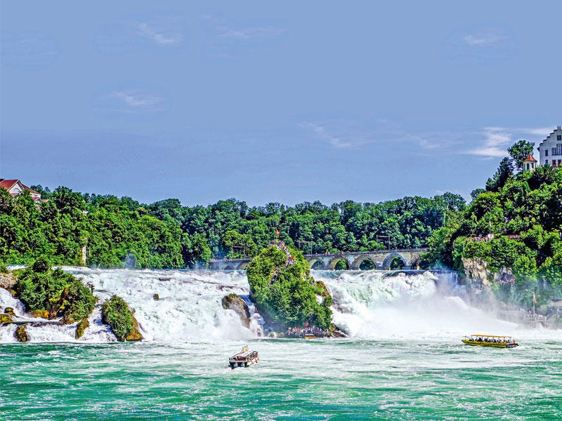 في شمال سويسرا وعلى بُعد ساعة تقريبا من زيوريخ بالقرب من الحدود الألمانية تنحدر شلالات الراين، وهي من أعلى شلالات أوروبا، ولا يمكن أن تصل إلى زيوريخ دون المرور بها، وقضاء نصف يوم فيها على الأقل.ويصل حجم تدفق المياه منها إلى 250 متراً مكعباً في الثانية، لذلك بني بجوارها قبل قرون أول مصنع لتصنيع الألومنيوم في أوروبا، ليستغل سرعة تدفق مياه تلك الشلالات في توليد الطاقة اللازمة للمصنع .وعند تلك الشلالات يمكن ممارسة الكثير من الأنشطة، كركوب مركب أو السباحة صيفا أو الجلوس لاحتساء المشروبات الساخنة أو الباردة في المقهى المطل عليها أو تناول وجبة غداء سريعة. فندق الملوك والرؤساء والمشاهير