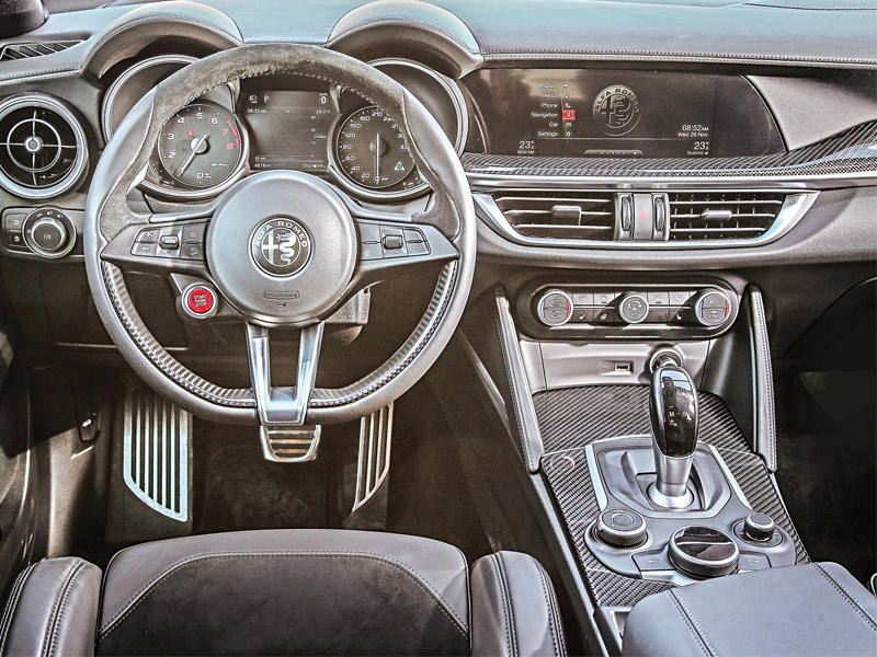 تضمن سيارة جوليا كوادريفوليو، المزودة بمحرك V6 ثنائي التوربو مصنوع من الألمنيوم بالكامل، تبلغ قوته 510 أحصنة، وسعته 2.9 لتر، وناقل حركة أوتوماتيكي من 8 سرعات، أداءً مذهلاً، إذ تبلغ سرعتها القصوى 307 كيلومترات في الساعة، والتسارع من 0-100 كيلومتر بالساعة في 3.9 ثوانٍ فقط وعزم أقصى يبلغ 600 نيوتن متر. وتتوفر جوليا أيضاً بمحركات تبلغ قوتها 200 حصان و280 حصاناً.ستلفيو