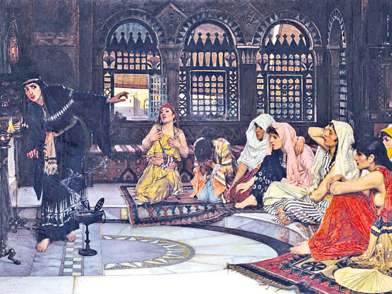 كانت الجارية انتهزت فرصة انشغال القوم بإنعاش الشاب البغدادي، فغادرت مكانها خلف الستارة، وأوت إلى مخدعها في السفينة، وهي لا تدري أن ذلك الشاب صاحبها، فلما علم الشيخ الهاشمي والبحارة بانصرافها، تكدروا غاية الكدر، وتوجهوا إلى مخدعها ووقفوا إزاء الستارة المضروبة عليه يصيحون بها ملتمسين منها أن ترجع إلى المجلس لتزيدهم من عزفها وغنائها. ولم يزالوا يلحون عليها بالرجاء والاستعطاف حتى قبلت. أما صاحبها الشاب البغدادي، فإنه انتهز فرصة انصراف القوم لإحضار جاريته، ونهض فتوجه إلى مكانها خلف الستارة وأمسك عودها وأصلحه بطريقة فنية غريبة كان قد علمها أياها. فلما رجعت وأرادت العزف على العود، فوجئت بإصلاح أوتاره بتلك الطريقة التي لا يعرفها أحد إلا هي وصاحبها الشاب البغدادي. تملكها العجب، وصاحت من وراء الستارة: من الذي أصلح أوتار العود؟ فقال لها الشيخ الهاشمي: أنت التي أصلحته، وما فينا أحد له علم بذلك. اشتد غضبها وصاحت قائلة: والله لا أعزف ولا أغني إلا إذا علمت من أصلح العود. لما سمع الشيخ الهاشمي كلامها، قال لمن حوله من الحاضرين غاضباً: هل بينكم أحد أمسك عود الجارية؟ فحلفوا جميعاً أنهم لم يمسوه. ولما رأى الشاب البغدادي إصرار الجارية على عدم الغناء حتى تعرف من أصلح عودها، وقف في مكانه بالمجلس، وقال للشيخ الهاشمي: معذرة يا سيدي، أنا الذي أصلحت عود الجارية. وأنا صاحبها الذي بعتها لك في بغداد، ثم لم يتمالك نفسه بعد ذلك، فأخذ في البكاء، إلى أن وقع في إغماء!وما كادت الجارية تسمع صوت الشاب البغدادي صاحبها الأول حتى خرجت من وراء الستارة، وألقت نفسها عليه وهي تبكي، ولم تزل كذلك إلى أن أغمي عليها هي أيضاً، ووقعت على أرض السفينة إلى جانبه. فتجمع الحاضرون حولهما، وأخذوا في إنعاشهما حتى أفاقا. ثم قال الشيخ الهاشمي للشاب البغدادي: ما الذي جرى لك حتى صرت بهذه الحالة التي أنت عليها؟ فقصّ عليه الشاب قصته من أولها إلى آخرها. لما فرغ من قصته، قال له الشيخ الهاشمي: لا بأس عليك يا ولدي. إني ما اشتريت جاريتك إلا لأسمع غناءها، وقد كبرت سني ولم يرزقني الله بولد، وأنا أشهد الله والحاضرين جميعاً على أني وهبتك جاريتك هذه، وإذا رغبتما في الإقامة معي، فكل ما أملكه رهن بأمركما، وكل ما أطلبه منكما أن تسعداني بعزفكما وغنائكما. شكره الشاب والجارية وقبلا يديه. كما شكره الحاضرون من الملاحين وغيرهم، ثم أمسكت الجارية عودها، وغنت هذه الأبيات، وهي تبكي من شدة الفرح: عيروني بأن سكبت دموعيبعد أن زال باللقاء ولوعيإنما هذه الدموع بقايازفرات حرى مشت في ضلوعيلا تلوموا على البكاء محباليس يطفي الأشواق غير الدموع طرب القوم طرباً شديداً، ثم أخذ الشاب العود من يد جاريته فأصلح أوتاره بطريقة غريبة أخرى، وغنى عليه هذه الأبيات: إن شكوت الغرام فاشك جهارا وابك ليلا كما تشا ونهارا ليس ذل الهوى بذل ولكنهو للمغرمين كان شعارافابك يا عين مرة بسرورمثلما قد بكيت حزنا مرارا اشتد طرف الحاضرين، ولم يزالوا كذلك حتى صباح اليوم التالي، فأقلعت بهم السفينة، مواصلة سيرها إلى البصرة. وعقد الشيخ الهاشمي قران الشاب البغدادي بالجارية، ثم أمر بالاحتفال بقرانهما في السفينة كل ليلة، إلى أن يصلوا إلى داره في البصرة، فيقيم لذلك احتفالا كبيرا.وأدركت شهرزاد الصباح، فسكتت عن الكلام المباح.وإلى اللقاء في حلقة الغد