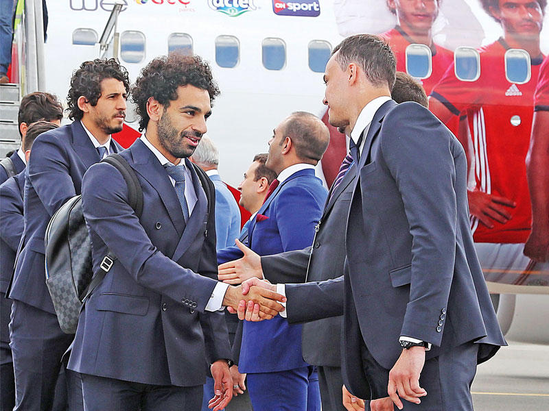 ويستهل منتخب مصر، بطل افريقيا سبع مرات، مشاركته الثالثة في كأس العالم بعد 1934 و1990 ضد الأوروغواي بطلة 1930 و1950 الجمعة المقبل في ايكاتيرينبورغ، ثم يواجه روسيا المضيفة في 19 يونيو الحالي في سان بطرسبورغ، قبل إنهائه منافسات المجموعة الأولى بلقاء عربي ضد المملكة العربية السعودية في 25 منه في فولغوغراد.وخرج اللاعبون من باب جانبي في ظل إجراءات أمنية مشددة، ووجود عناصر الجيش والشرطة، واستقلوا حافلة كتب عليها الشعار المعتمد "لما نقول الفراعنة الدنيا تقوم تسمعنا"، متجهين إلى مقر اقامتهم في فندق "ذا لوكال"، الذي انتهى العمل به قبل اسابيع قليلة باستثمار إماراتي، ويبعد نحو 10 كيلومترات عن المطار. ويجري المنتخب المصري تمارينه على ملعب "أحمد أرينا" الذي يبعد نحو 500 متر عن الفندق، وسيفتح أبوابه امام الجماهير في تدريبه الاول، الذي شهد هطول امطار غزيرة بعد هبوط الطائرة رغم الحرارة المرتفعة (28 درجة مئوية).وعدلت الشركة الراعية للمنتخب الرسومات الخاصة باللاعبين على الطائرة الرسمية، بعد انتهاء الأزمة بين الاتحاد المحلي وصلاح، بسبب وضع صورته بجوار شعار شركة اتصالات منافسة للشركة التي تمتلك تقوم برعاية اللاعب.وكان منتخب الفراعنة خاض السبت تمرينه الأخير على استاد القاهرة أمام حضور تم تحديده من قبل قوى الأمن بخمسة آلاف متفرج، بعد ان استقبلهم الرئيس عبدالفتاح السيسي، وطالبهم بـ"القتال لتحقيق حلمهم واسعاد الشعب".وتواجد في التمارين صلاح (25 عاما) هداف ليفربول وافضل لاعب في الدوري الإنكليزي، الذي خضع لفترة علاج في اسبانيا، بعد خروجه من نهائي دوري أبطال أوروبا مصابا بكتفه اثر تدخل عنيف من مدافع ريال مدريد الإسباني سيرخيو راموس في نهاية مايو الماضي، قال بعدها الاتحاد المحلي ان فترة غيابه لن تزيد على ثلاثة اسابيع.وقال طبيب المنتخب محمد أبوالعلا، أمس، في تصريح تلفزيوني، إن "مصير مشاركة صلاح في المباراة الاولى سيتحدد في اليومين المقبلين. لن ندفع به إلا في حال شفائه تماما".وعن خوض المباراة الأولى بعد انتهاء فترة الصيام، اضاف "فسيولوجيا قد لا يكون الأمر سهلا، لكنه وضع قائم ويجب أن نتأقلم معه".
