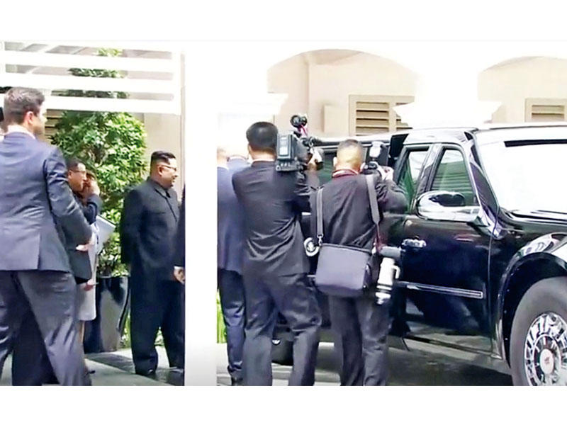 استغل الرئيس دونالد ترامب قمته التاريخية مع الزعيم الكوري الشمالي، ليستعرض سيارته الليموزين الرئاسية.فبعدما أنهى ترامب وكيم غداء عمل، بدا أن الرئيس الأميركي قام بوقفة غير مقررة في جدول أعمال القمة، من أجل إظهار سيارته المدرعة الضخمة، المعروفة باسم "الوحش".وابتسم الزعيم الكوري الشمالي بعدما سمح له ترامب بإلقاء نظرة نادرة داخل السيارة التي تبلغ تكلفتها 1.6 مليون دولار، والمصممة من أجل حماية الرئيس من هجوم عسكري أو حرب كيماوية.